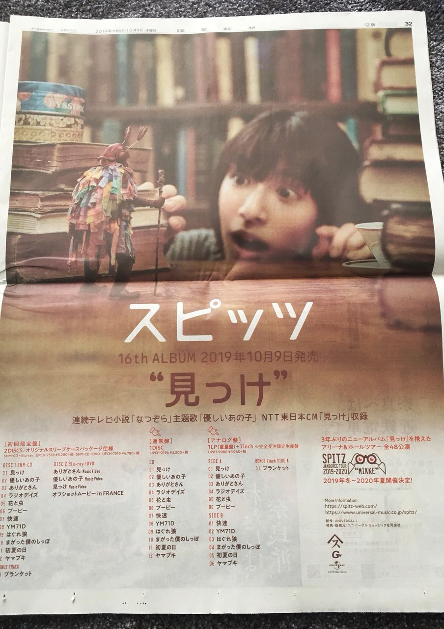 | 『見っけ』(みっけ)は、日本のロックバンド・スピッツの通算16作目のオリジナルアルバムである。2019年10月9日にユニバーサルJより発売。 前作『醒めない』から3年2か月振り、通算16作目となるオリジナル・アルバム作品である。前作同様に複数形態での発売となり、初回限定盤(SHM-CD+Blu-ra 7キロバイト (332 語) - 2019年10月8日 (火) 17:39 |