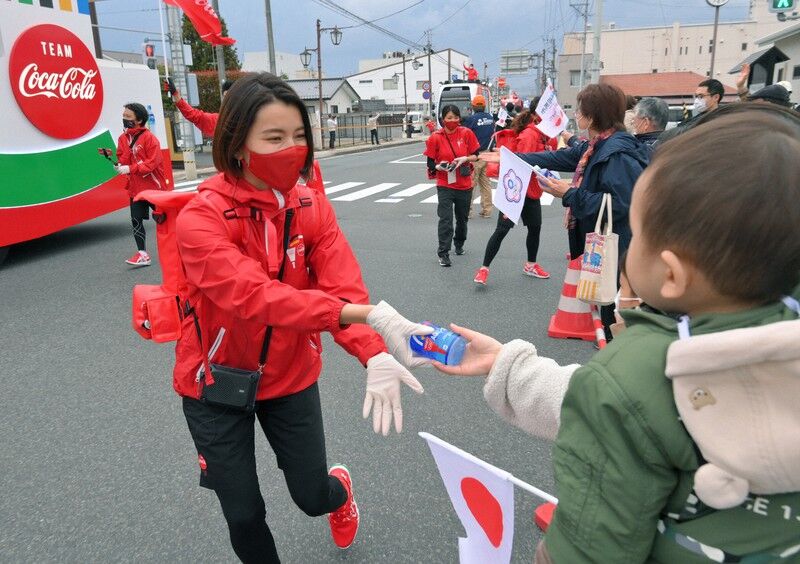 沿道の子供にコカ・コーラを配布