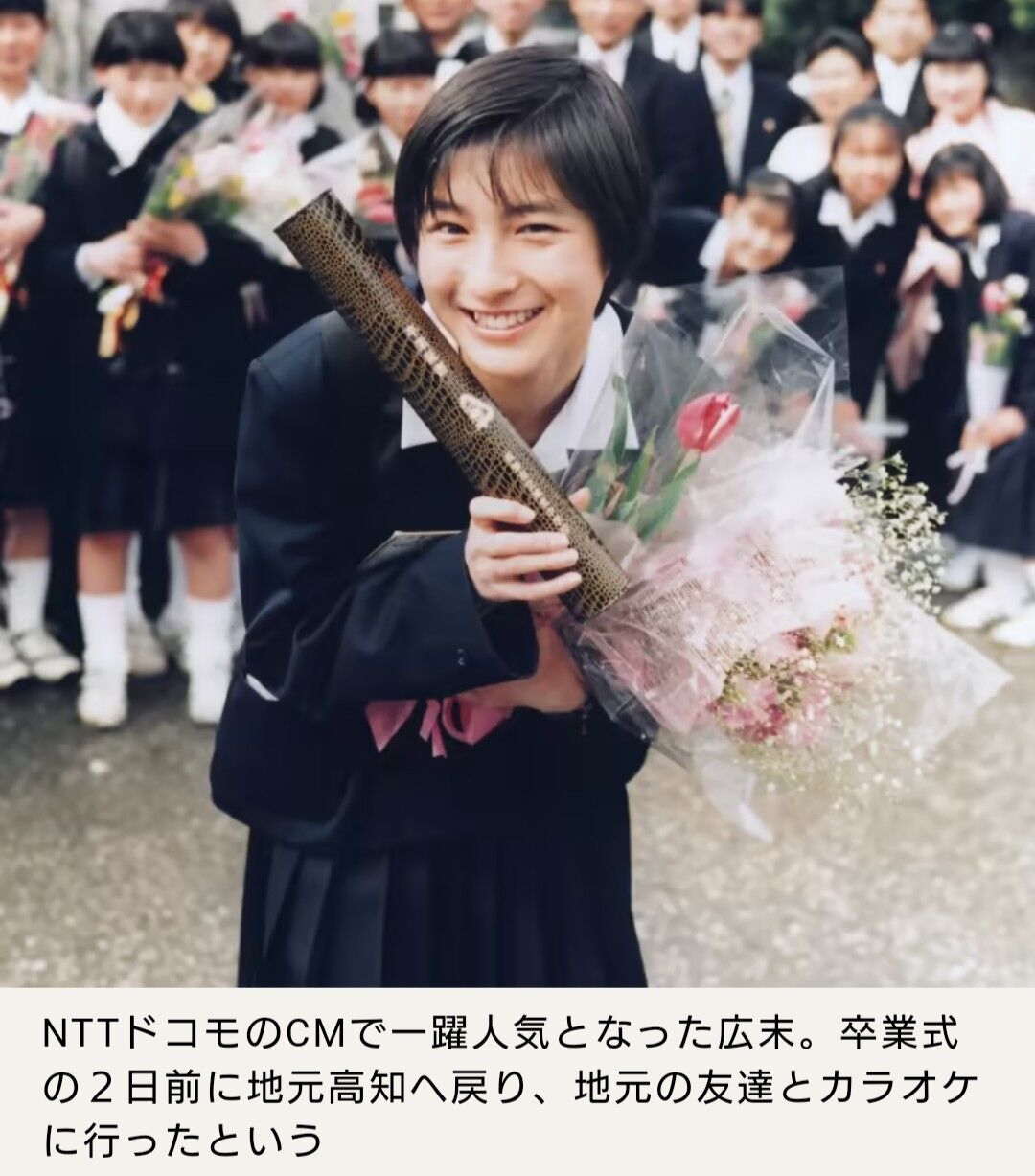 ’95年、清純派アイドルとして、14歳で芸能界デビューを果たし、以来、広末は多忙な生活を送ってきた。本誌が最初に広末の姿をとらえたのは、彼女の中学校の卒業式だった。中3の3学期は2日間しか通えなかったにもかかわらず、彼女の目にはうっすらと涙が浮かんでいた。