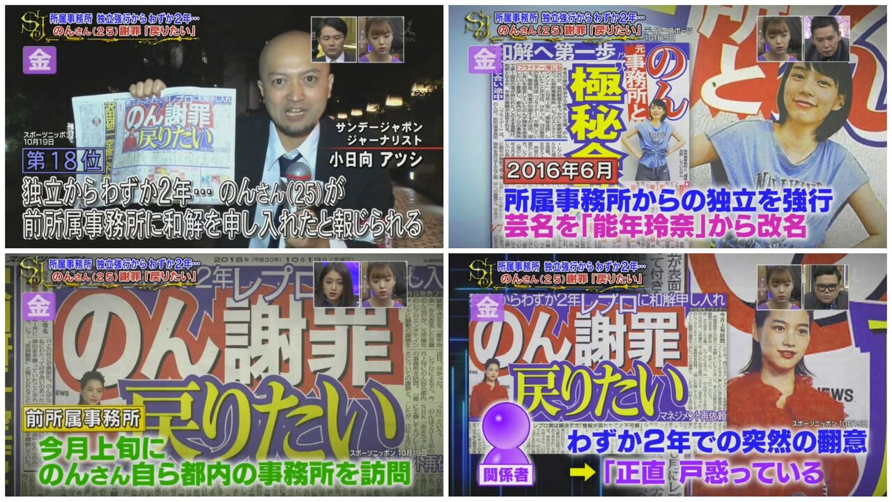 30…レプロと週刊文春の裁判進行中、文春敗色濃厚になる、のんがレプロに戻りたいですと謝罪に行くも許して貰えず