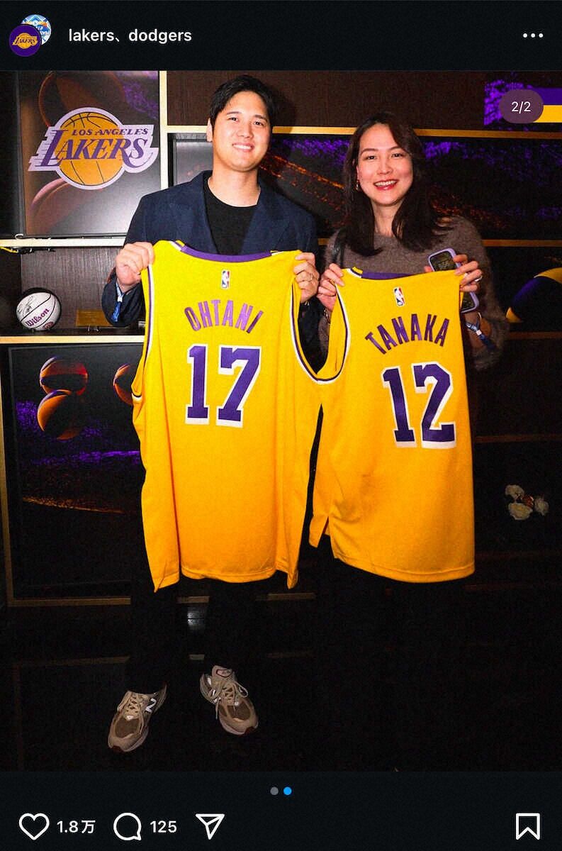 レイカーズの公式SNSでは、大谷と真美子さん仕様の特別ユニホームを持って笑顔の夫婦2ショット写真も投稿した。
