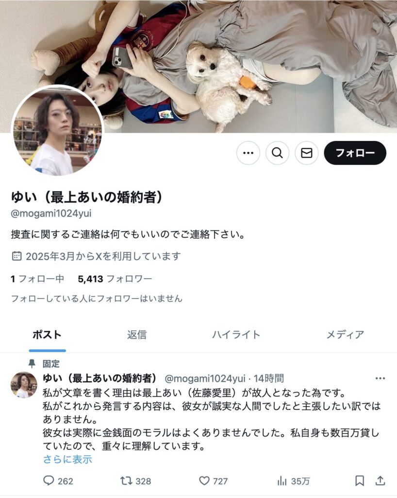 12日午後には、「私が文章を書く理由は最上あい(佐藤愛里)が故人となった為です。 私がこれから発言する内容は、彼女が誠実な人間でしたと主張したい訳ではありません。 彼女は実際に金銭面のモラルはよくありませんでした。私自身も数百万貸していたので、重々に理解しています。 しかし、今Xに上がっている情報は凶行に及んだ犯人が事前に世に流している情報に見受けられます」と言及。