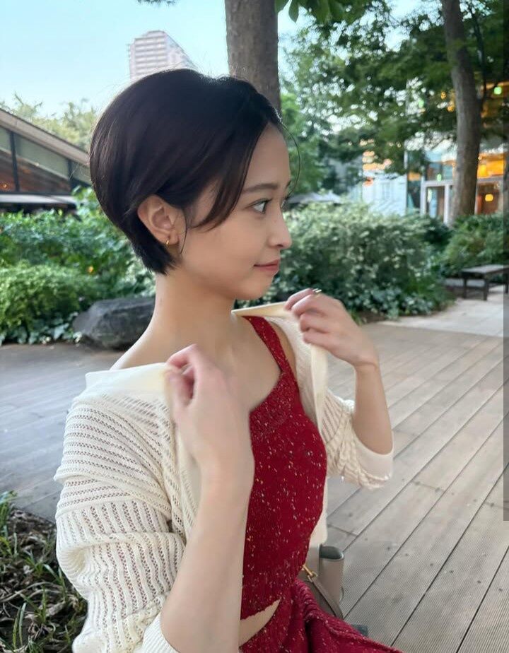 「まだちょっと暑かった時の私服」とつづり、「@pinue_official のセットアップに、ユニクロのカーディガン! 最近前髪あげたり、センター分けしたりしてることが多いです」と投稿。赤のトップスとボトムスの間からお腹がチラリと見えるコーデに、軽やかな笑顔を添えている。