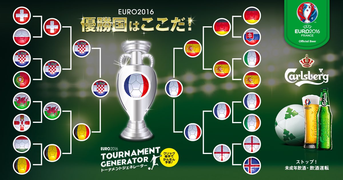 @marine_football大会前に俺の挙げた優勝候補(スペイン、ドイツ、フランス、イングランド)が全部トーナメントの右山にwwwこれ死闘を制して決勝まで辿り着いたチームが疲れきって決勝でボコられるパターンやwww#EURO2016